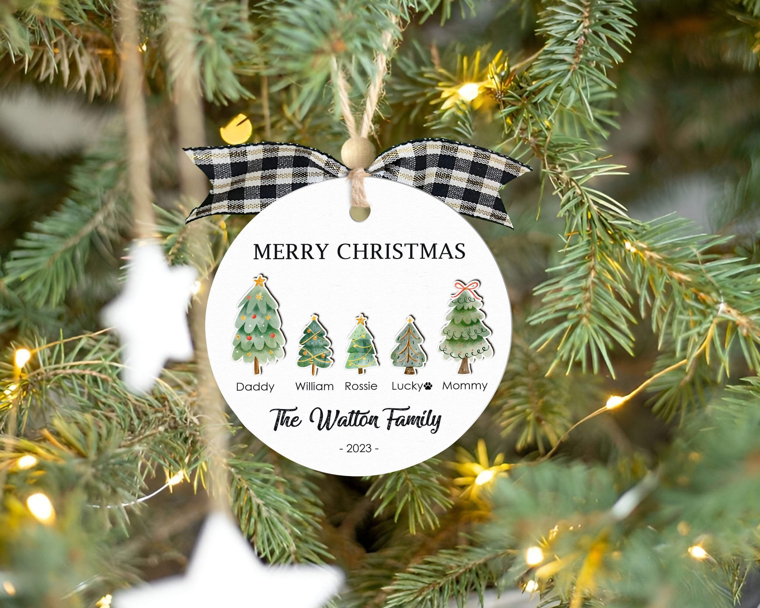 1. Each family member's name + christmas tree + details (big/small/paw).